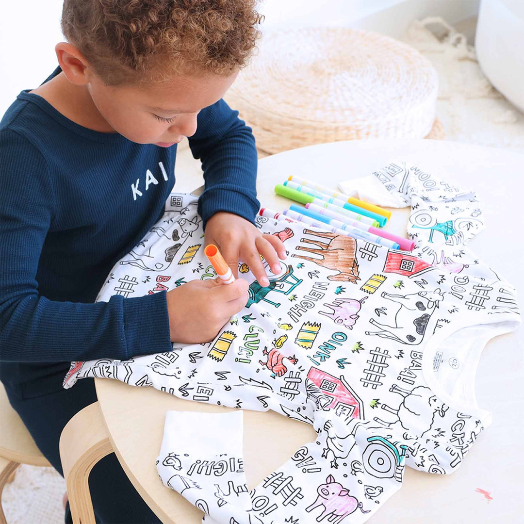 Notre concept unique repose sur des feutres lavables en machine. Une fois colorié, le pyjama passe en machine et revient comme neuf, prêt pour une nouvelle session artistique ! C’est une expérience renouvelable, durable et zéro ennui. Les enfants ne s’en lassent jamais, et les parents font des économies sur les activités à la maison.