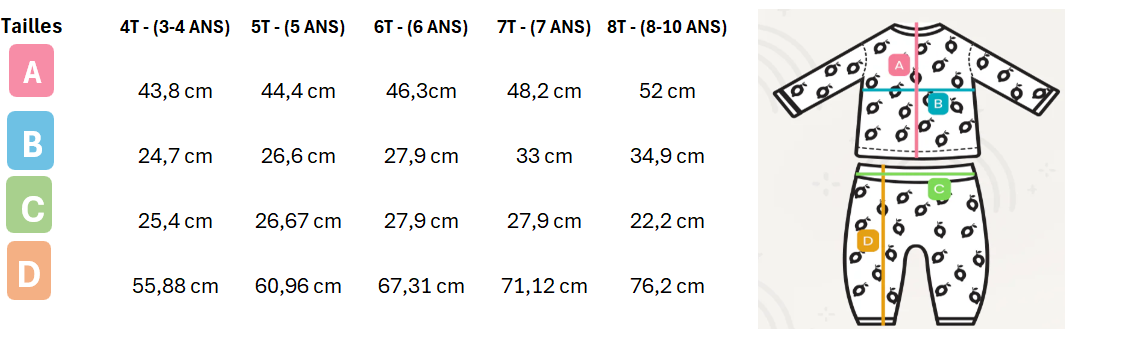 Les pyjamas sont disponibles dans des tailles pour les enfants âgés de 3 à 8 ans, garantissant un ajustement confortable pour un large éventail d'âges. Nous vous conseillons de regarder le tableau des tailles dans les images ci-dessus pour plus de clarté avant l'achat.